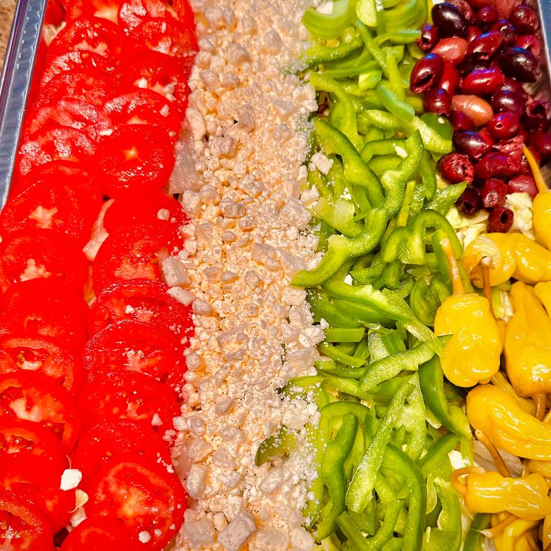 Half Tray $37.99 | Full Tray $59.99 • Mixed iceberg and romaine lettuce, red cabbage, green bell peppers, pepperoncini, kalamata olives, tomatoes, and feta cheese. Greek dressing.